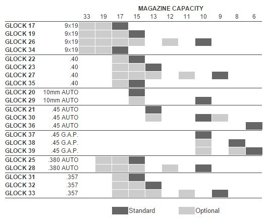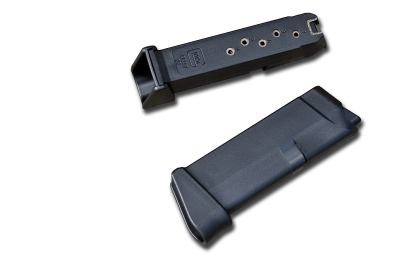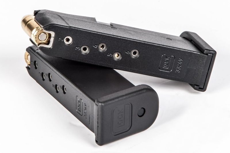 Each GLOCK magazine is constructed from a hardened steel insert encased in high tech polymer to protect the magazine and prevent deformation, even when dropped from a great height. The high quality spring and follower ensure reliable feeding from the first round fed by a fully compressed spring down to the last shot. Its double cut magazine body also works with a reversed magazine catch on Gen 4 GLOCK pistol models.