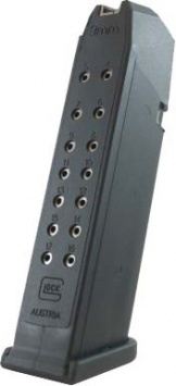 Each GLOCK magazine is constructed from a hardened steel insert encased in high tech polymer to protect the magazine and prevent deformation, even when dropped from a great height. The high quality spring and follower ensure reliable feeding from the first round fed by a fully compressed spring down to the last shot. Its double cut magazine body also works with a reversed magazine catch on Gen 4 GLOCK pistol models.